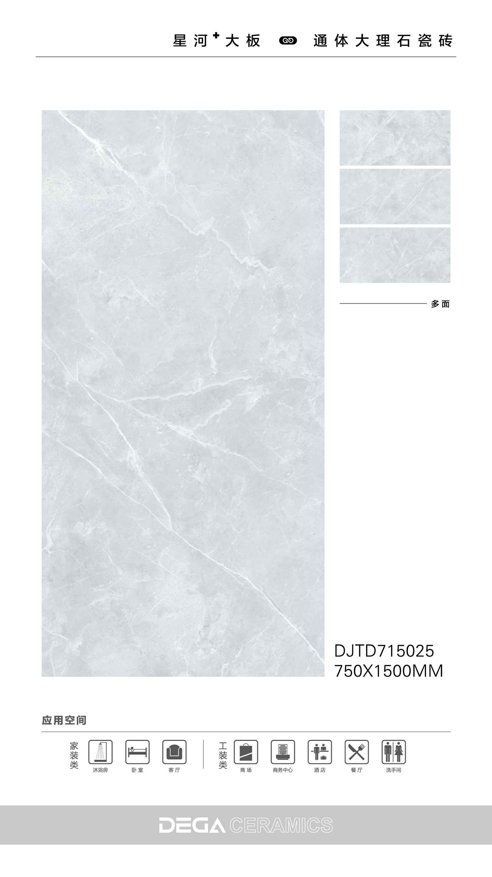 从规格形式的选择、纹理的趣味,到丰富内涵的表现、文化的传承等…… 都是她的每一侧面,在750X1500MM创造的舞台中央,是属于一片瓷砖传奇剧的演出。